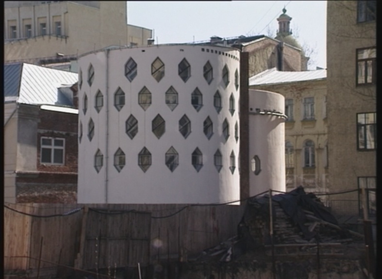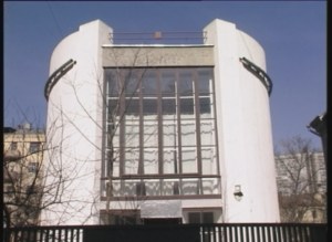 The second film in the series “The Russian Avant-garde” grew out of the first in that Rodchenko phot0graphed many of the new buildings which had been built in Moscow and which were themselves a product of the avant-garde. Through researching Rodchenko I quickly became interested in the Russian avant-garde as a whole and the outline of a second film had already began to emerge before the first was finished. I researched the buildings I wanted to film and spent a few weeks travelling across Moscow discovering where they were located and how best to film them. I really wanted to show the relationship between avant-garde art and its influence on architectural design of that period. I decided to structure the film around 3 main figures: Tatlin, Malevich and Melnikov. I wanted to start work in April using the same cameraman, Valentin Savenkov, as I used on the Rodchenko film. I also wanted to start in early April as some of the buildings would be hidden by trees once the leaves started to grow. We managed to get going in late April but because the spring is late in Moscow there was no real problem with leaves on trees. Some of the buildings were suffering from neglect as can be seen in the film but many were in remarkably good condition. Filming on the streets of Moscow is not without an occasional adventure and the Architecture film was no exception. The first problem arose when we wanted to film inside the house that Melnikov had built for himself, a construction of two cylinders inter-cut into each other. Valentin said that maybe Melnikov’s son who lives there now would let us film inside. It might seem amateurish, not having planned this before and then suddenly decide to knock on someones door on the off chance that they will allow us to film inside their home but in Russia this is quite acceptable. We rang the bell and the gate was opened by an eighty year old man who was Melnikov’s heir and son. Thin and wiry, he looked at us with a quizzical expression of curiosity and annoyance. Valentin explained the situation and then let slip that the film was about constructivist architecture. I knew this was a mistake and I was not making a film about constructivist architecture in any case. Melnikov’s son looked at us with a hurt expression in his eyes, saying, in an pained tone of voice, “Papa wasn’t a constructivist – Papa was an artist”. That was it, I knew we weren’t going to get in under any circumstances. I went back a few days later by myself and tried to negotiate with him but again it was no good. I could see he was tired of film crews and people wanted to look inside the building all the time.